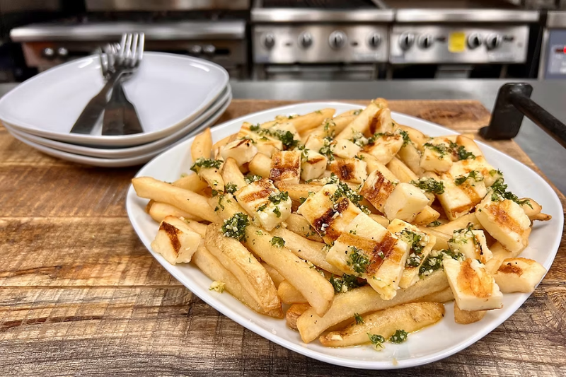 4. Coloque as batatas fritas num prato, cubra com pedaços de queijo coalho e pulverize com a mistura de azeite, alho e salsa.