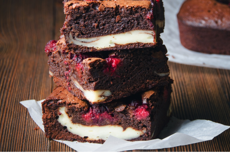 4. Coloque na forma metade do brownie. Com cuidado, adicione pequenas colheradas de Recheio Genuine Branco. Adicione uma camada fina de geleia de frutas vermelhas.