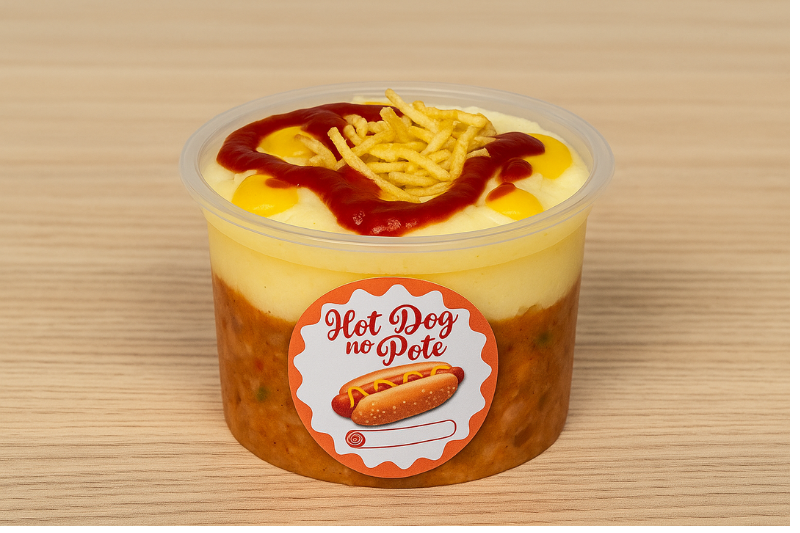 3. Em um pode de 500 ml, faça uma camada de molho de salsicha, uma camada de purê, mussarela, e uma camada de pão, repita até chegar ao topo do pote.