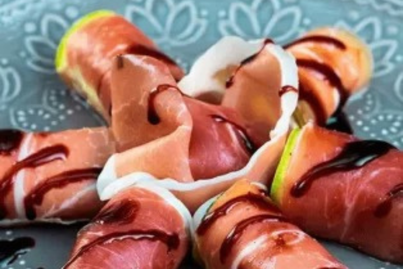 6. Dispor os rolinhos em um prato e finalizar com gotas de redução de vinagre balsâmico.