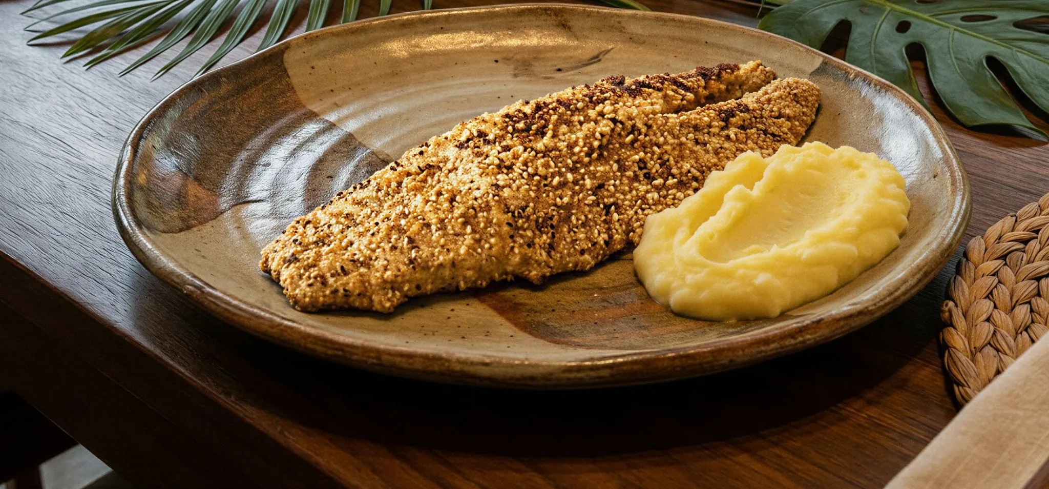 Filé de tilápia com crosta de castanha de caju acompanhado de purê de batata, prato leve e sofisticado.