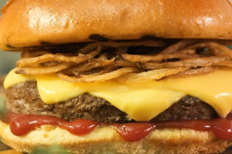 8. Adicione uma porção de cebola crispy, espalhe o ketchup na metade superior do pão e feche o sanduíche.