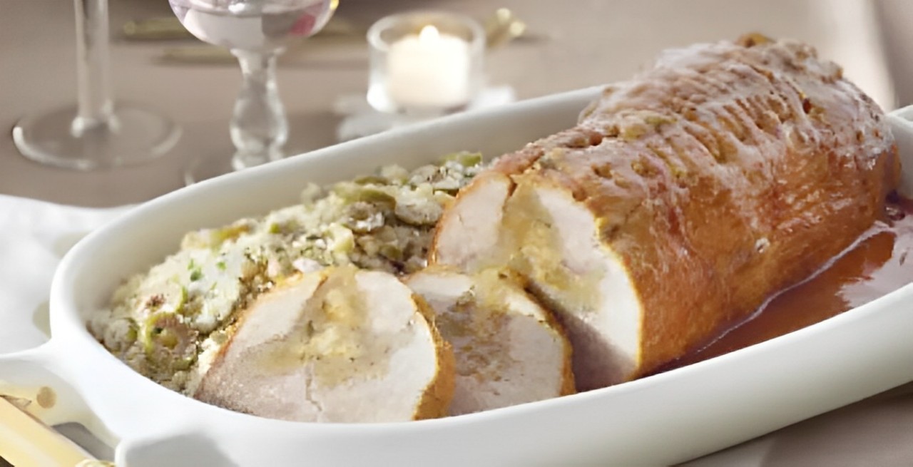 1. Coloque o lombo novamente sobre a tábua e espalhe parte da farofa sobre ele.