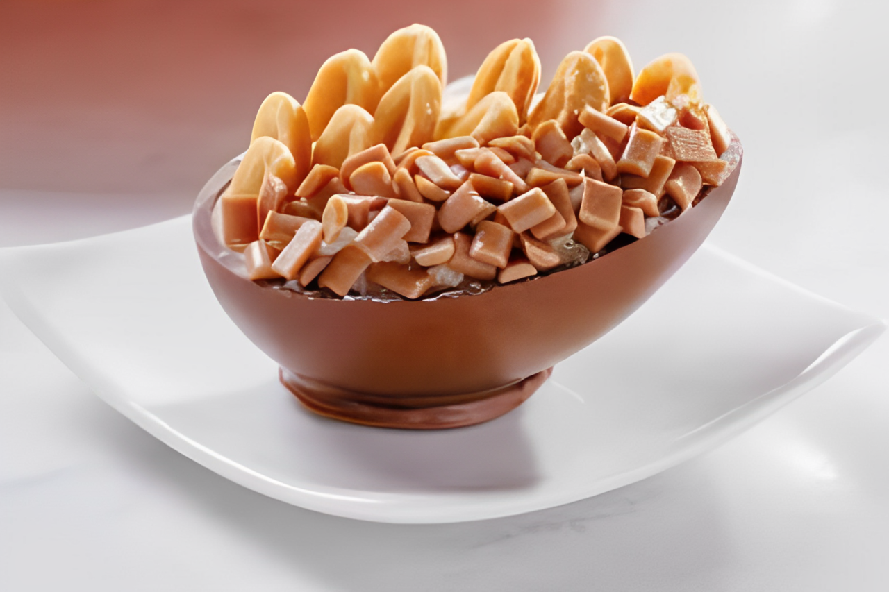 8. Recheie com o creme de paçoca e decore com o amendoim torrado em metades e Granulé Melken Caramelo.