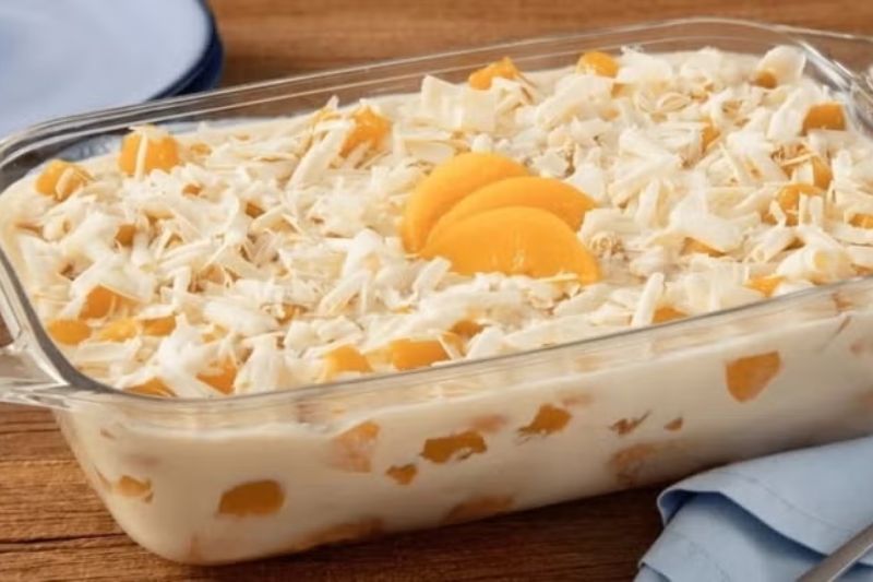 Repita a operação, fazendo novamente uma camada de biscoitos umedecidos na calda, seguidos por uma camada do creme, finalizando com os pêssegos picados.