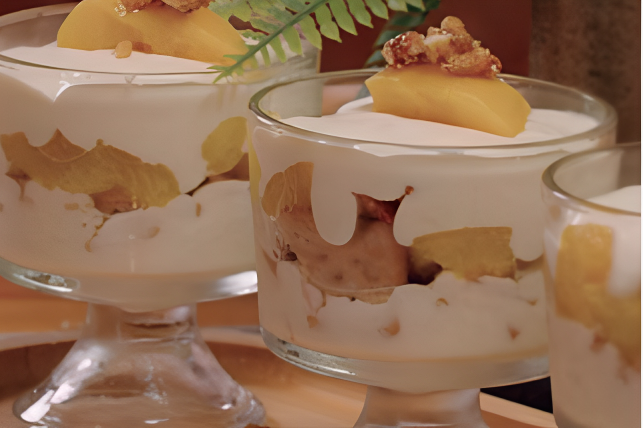 1. Coloque em taças, uma camada de creme, depois esfarele o bolo, umedeça na calda do pêssego, adicione uma camada de bolo, depois uma camada de nozes e uma camada de pêssego.