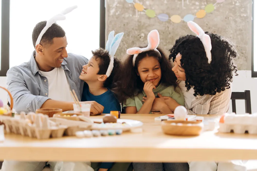 Família reunida em clima de celebração para a Páscoa, representando a data comemorada em 2026.