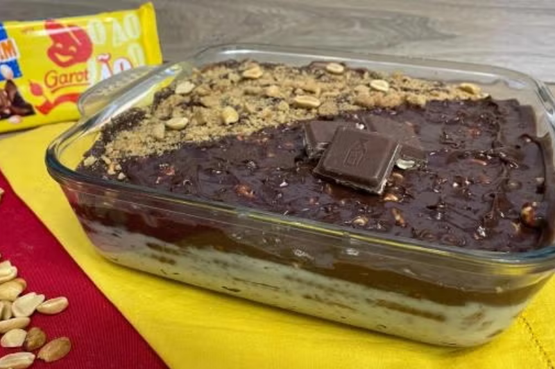 2. Cubra com um papel plástico e leve para a geladeira por cerca de 2 horas até estar completamente gelado. Decore com amendoins picados e sirva.