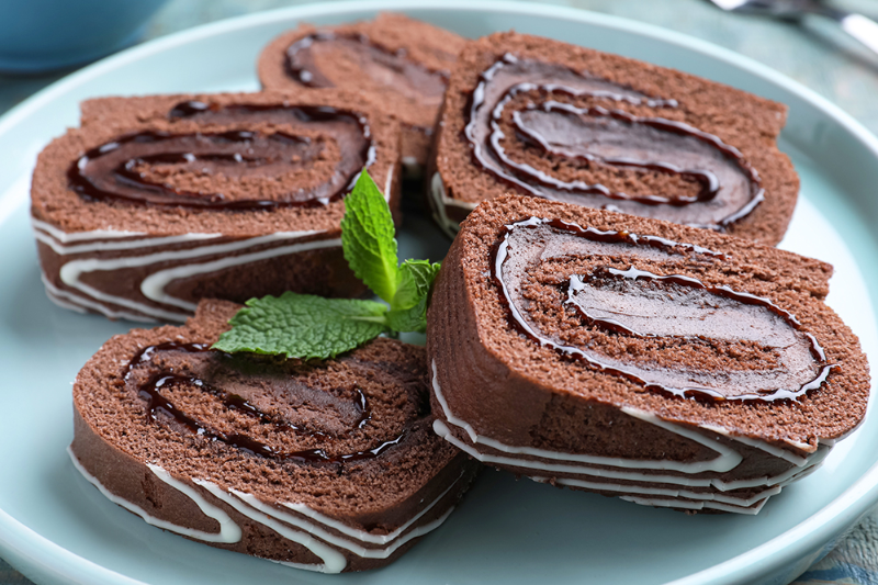 1. Recheie o rocambole com o recheio escuro, enrole e cubra com a cobertura branca.