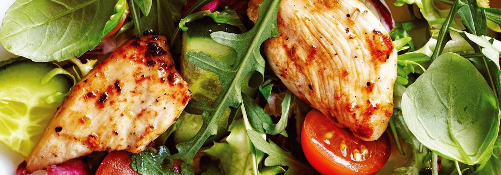 6- Em uma saladeira grande, disponha as folhas de rúcula e de alface, previamente misturadas, o abacate, a cenoura e o frango. Regue com o molho reservado e sirva em seguida.