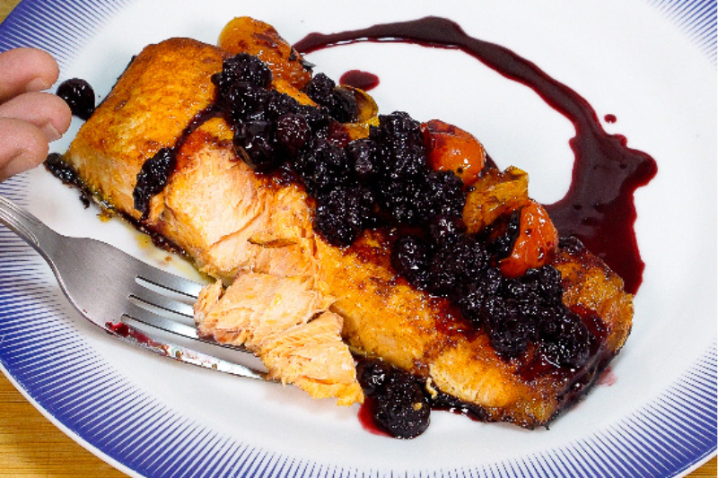 4. Retire o salmão do forno e sirva com os tomates assados, regando por cima com o molho de frutas vermelhas.