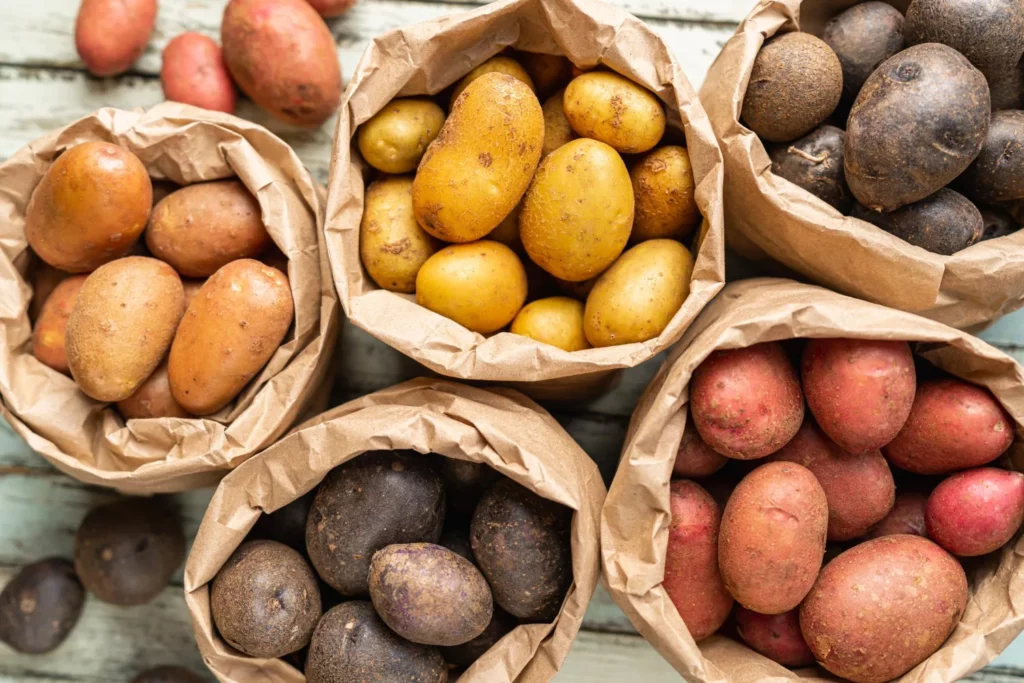 Diversas variedades de batata em sacos de papel: diferentes tipos para diferentes usos culinários
