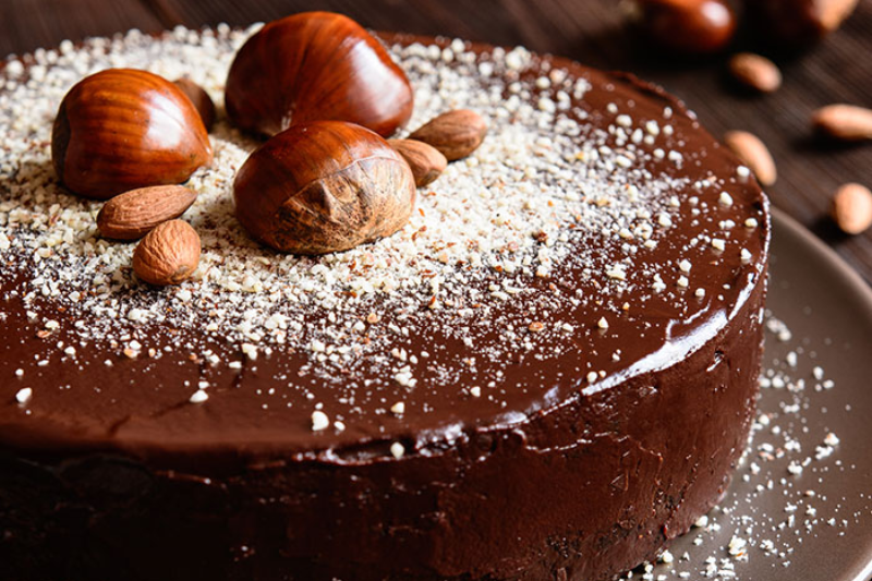 5. Desenforme, coloque em cima de uma grade e cubra com o ganache líquido ainda. Deixe escorrer e decore com raspas de Chocolate Genuine.