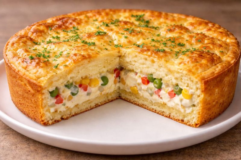 4. Em uma forma untada, despeje metade da massa, espalhe o recheio cremoso e cubra com o restante da massa.